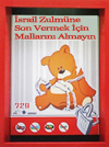 Boykot posterlerinde birinde oyuncak bir ayı “işgal edenin mallarından almamak” için uyarıda bulunuyor çünkü “İsrail,